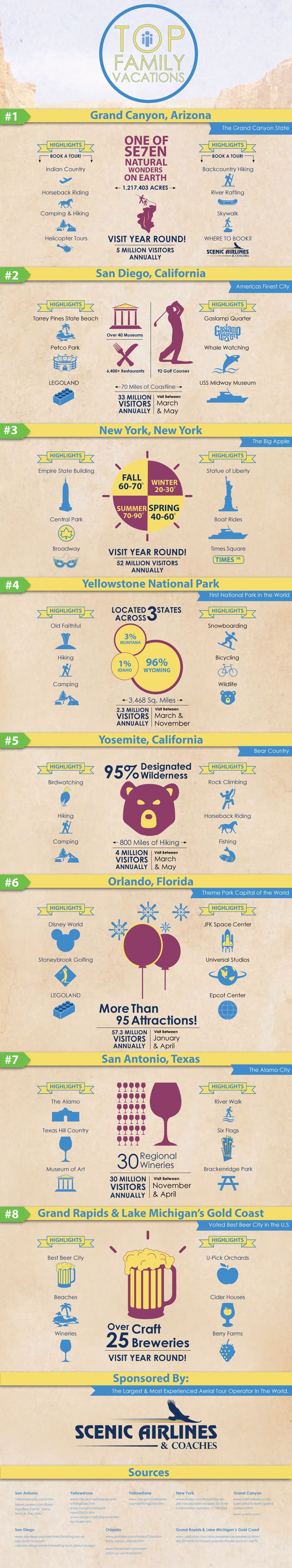 One of the seven natural wonders on Earth, the Grand Canyon gets around five million visitors each year and offers hiking, horseback riding, camping, helicopter tours, and more. The San Diego area has some of the best beaches in America, in addition to attractions such as Legoland, Sea World, and Petco Park. A trip to New York City is a must for everyone in your family, or you can visit Yellowstone National Park in Wyoming for a natural getaway unlike any other. No matter what the interests are in your family, you will be sure to find the perfect spot for your next family vacation.
