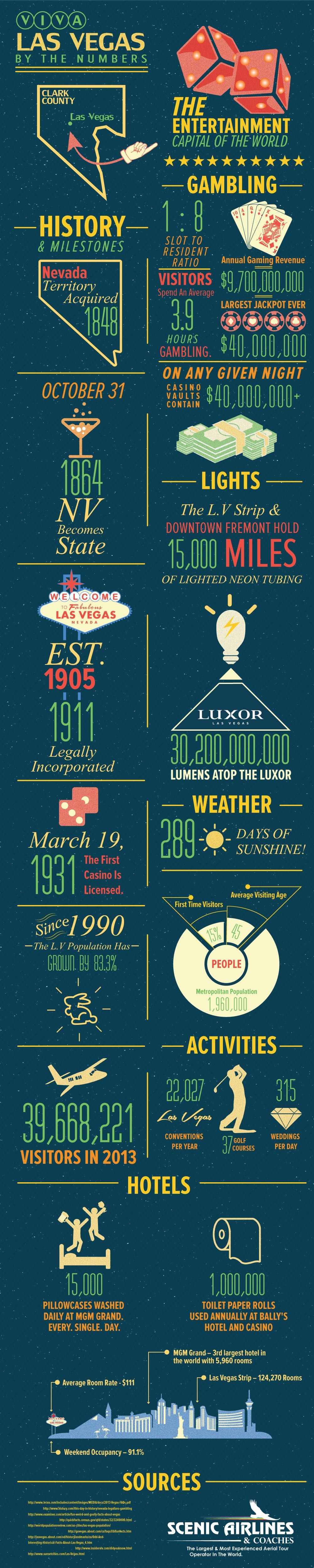 Since that time the population of Las Vegas has exploded, growing by over 83 percent since 1990 alone. The city saw nearly 40 million visitors in 2013, 15 percent of which are visiting Las Vegas for the first time. It is no surprise that gambling is the major industry and source of income for the town. This can be seen in the fact that there is one slot machine in Las Vegas for every eight residents. Each year the city makes about $9.7 billion in gaming revenue, while the largest jackpot ever topped out at $40 million. Before your next trip to fabulous Las Vegas, learn more about the rich history and economic importance of the city.